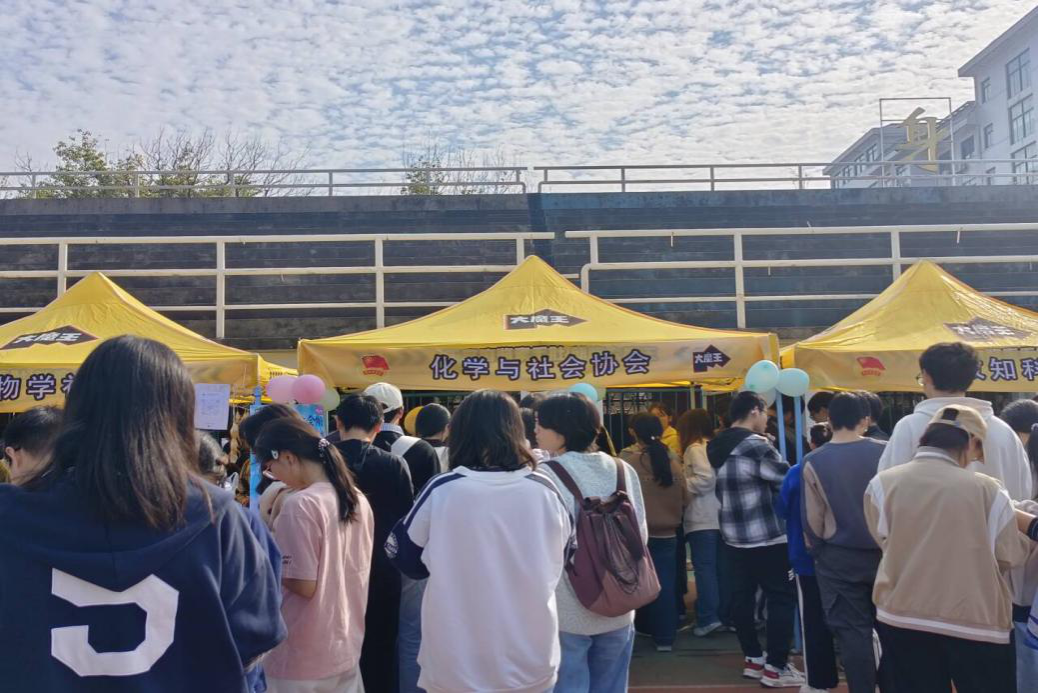 此次活动以化学特色为核心设置互动体验环节,通过知识问答、实验闯关等形式传递化学魅力。理事会成员向驻足同学系统介绍协会趣味化学实验、社区公益宣讲等核心活动体系,同时联合球社协会演绎歌剧《稻香(化学版)》,表演将学科元素与文艺表演创新融合,吸引众多同学咨询报名。