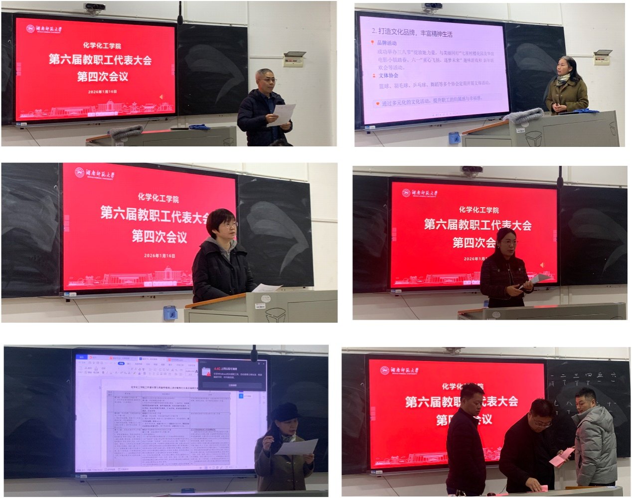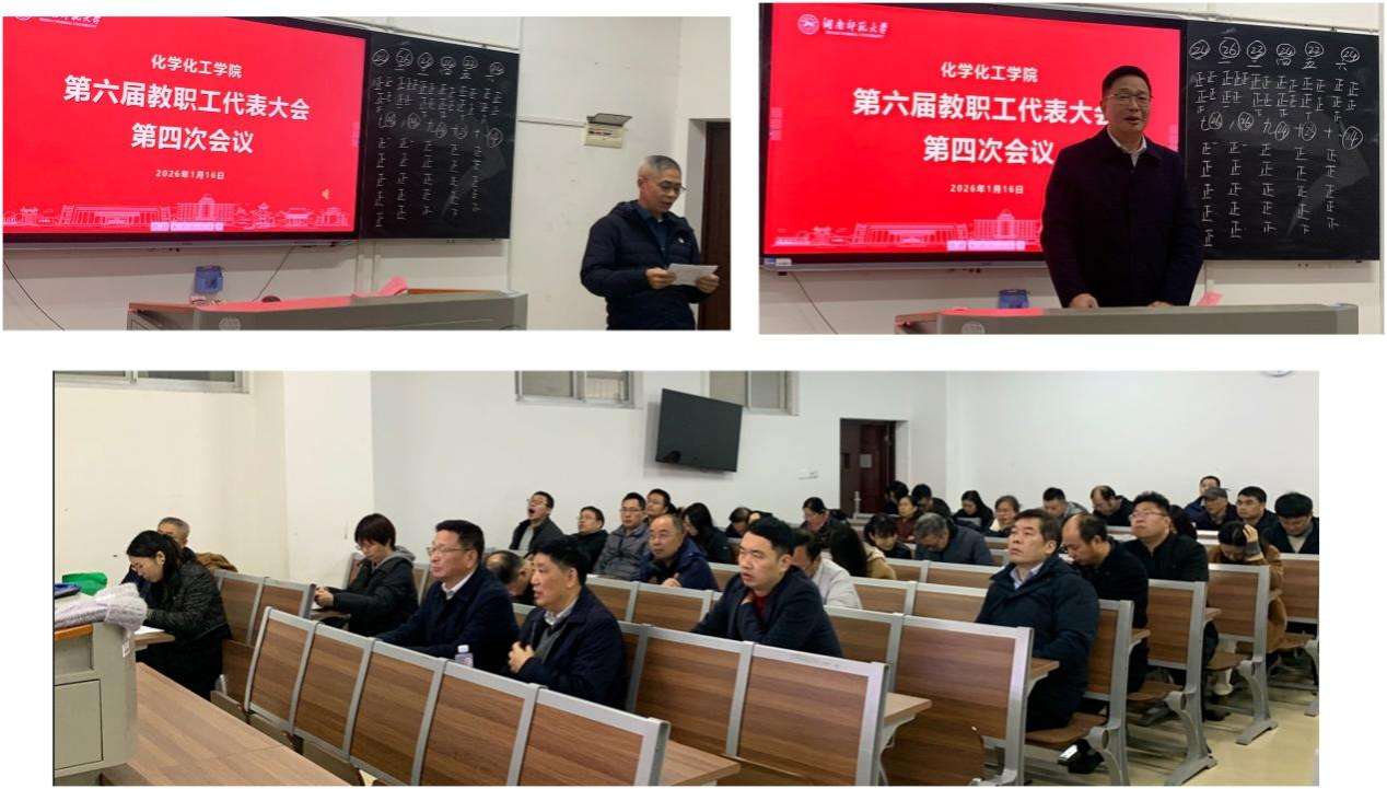 2026年1月16日上午,化学化工学院第六届教职工代表大会第四次会议在化学楼117教室举行。学院党委书记谭东波、院长杨荣华,副院长谭亮、宋春红、谭蓉,以及工会主席余丽萍出席会议。会议由工会副主席梁云主持。