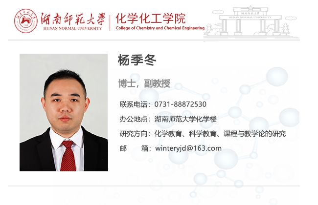 杨季冬,男,1991年生。教育学博士,湖南师范大学副教授,化学系副主任,硕士生导师。湖南省基础教育兼职教研员,华中师范大学兼职硕士生导师。2020年6月获得华中师范大学课程与教学论专业博士学位,毕业后于湖南师范大学任教,主要从事化学教学论相关研究与教学工作。课题组致力于严谨的化学教育学术研究,欢迎对该领域感兴趣的研究生、本科生加入课题组。