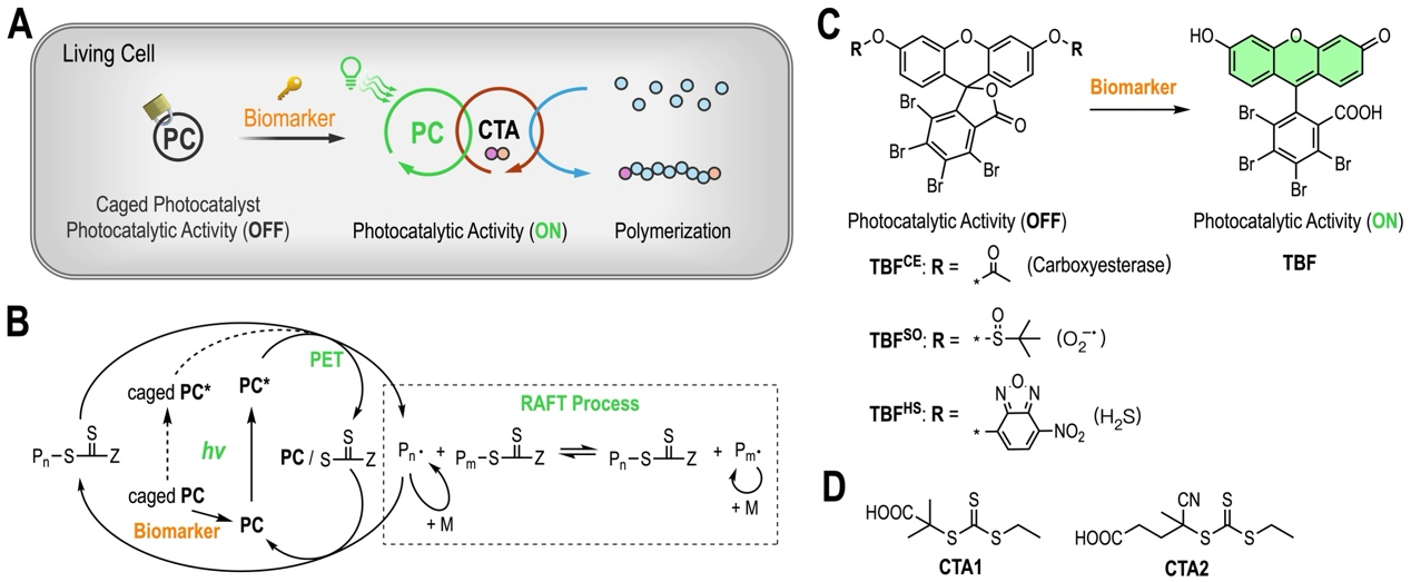 近日,我院杨荣华/刘固寰教授团队成功开发了一种基于生物标志物响应的光催化体系,首次在活细胞内实现了生物-光双重调控的自由基聚合(PET-RAFT),成果发表于《J. Am. Chem. Soc.》,标题为:“Bio-Photo Dual Action of Intracellular Radical Polymerization”。该技术通过设计对活性氧/硫物种(ROS/RSS)和羧酸酯酶敏感的溴化荧光素(TBF)衍生物,利用“AND逻辑门”激活机制(需同时满足生物标志物触发与光照条件),解决了传统预合成聚合物递送效率低、脱靶泄漏及生物相容性差等核心瓶颈,为合成生物学提供了革命性工具。