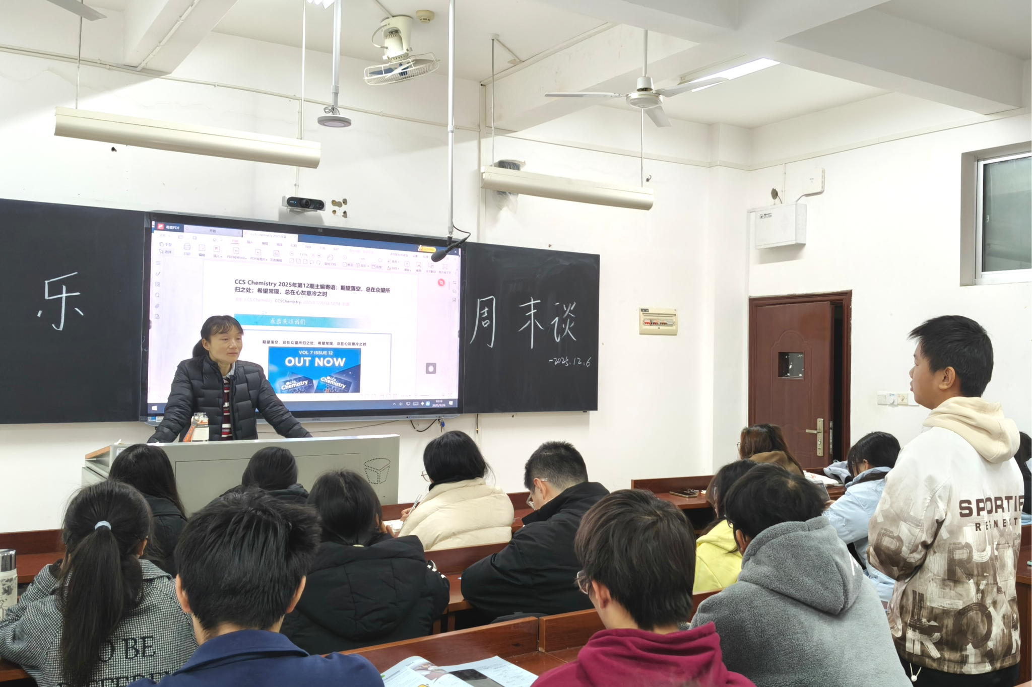 (通讯员 张艾平)12月6日上午,我院学生会办公室在化学楼210教室组织开展第357期快乐周末谈活动。此次活动由我院化学系谭蓉教授主讲,部分23级、24级以及25级学生参与。