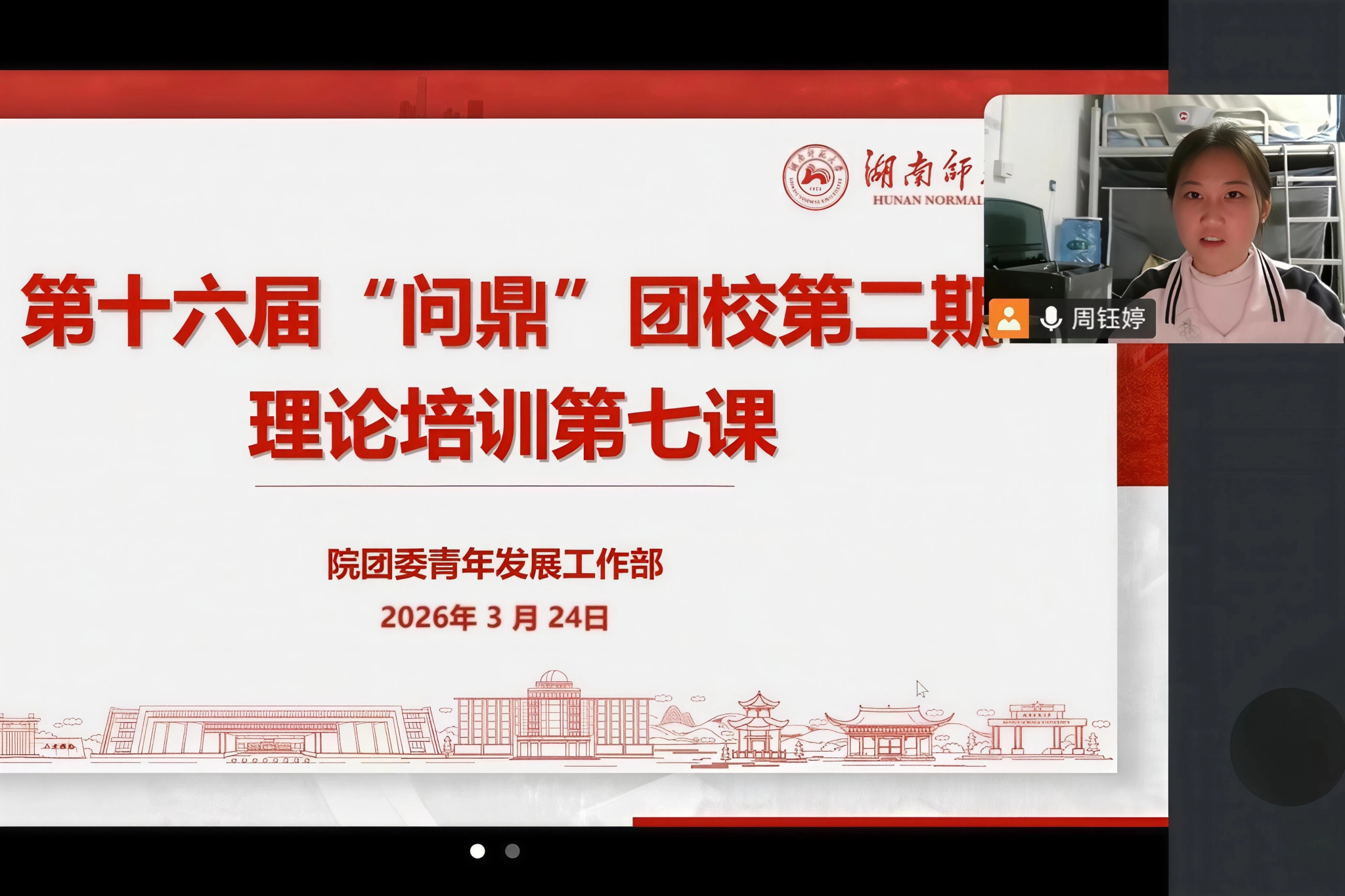 (通讯员 周钰婷 杨绣云)3月24日下午,化学化工学院第十六届“问鼎”团校理论培训第七课以线上腾讯会议形式开展。此次活动以“遵义精神永铸,红色薪火相传”为主题,由院团委青年发展部干事周钰婷主持,第十六届“问鼎”团校全体学员共同参与。