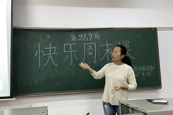 (通讯员 李晓慧)4月24日上午9时,化学化工学院举办的第269期“快乐周末谈”在化工院117教室开展,1908班班导师杨蓉作为特邀嘉宾出席此次快乐周末谈。