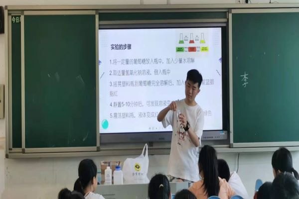 开始上课后,李胜辉提出“化学是什么”和“进行化学实验需要注意哪些安全问题”两个问题。同学们积极讨论,并发表自己的看法。讨论结束,李胜辉通过放映视频,为同学们解答了什么是化学,并一再强调做实验的“三不原则”。在确保安全的情况下,李胜辉先进行了教学演示实验。接着,学生们在助教老师的指导下,也完成了自己的实验。
