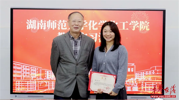 会上,湖师大化学化工学院尹笃林教授向长沙麓山国际昌济中学柳瑶老师颁发教育实习指导教师聘书。