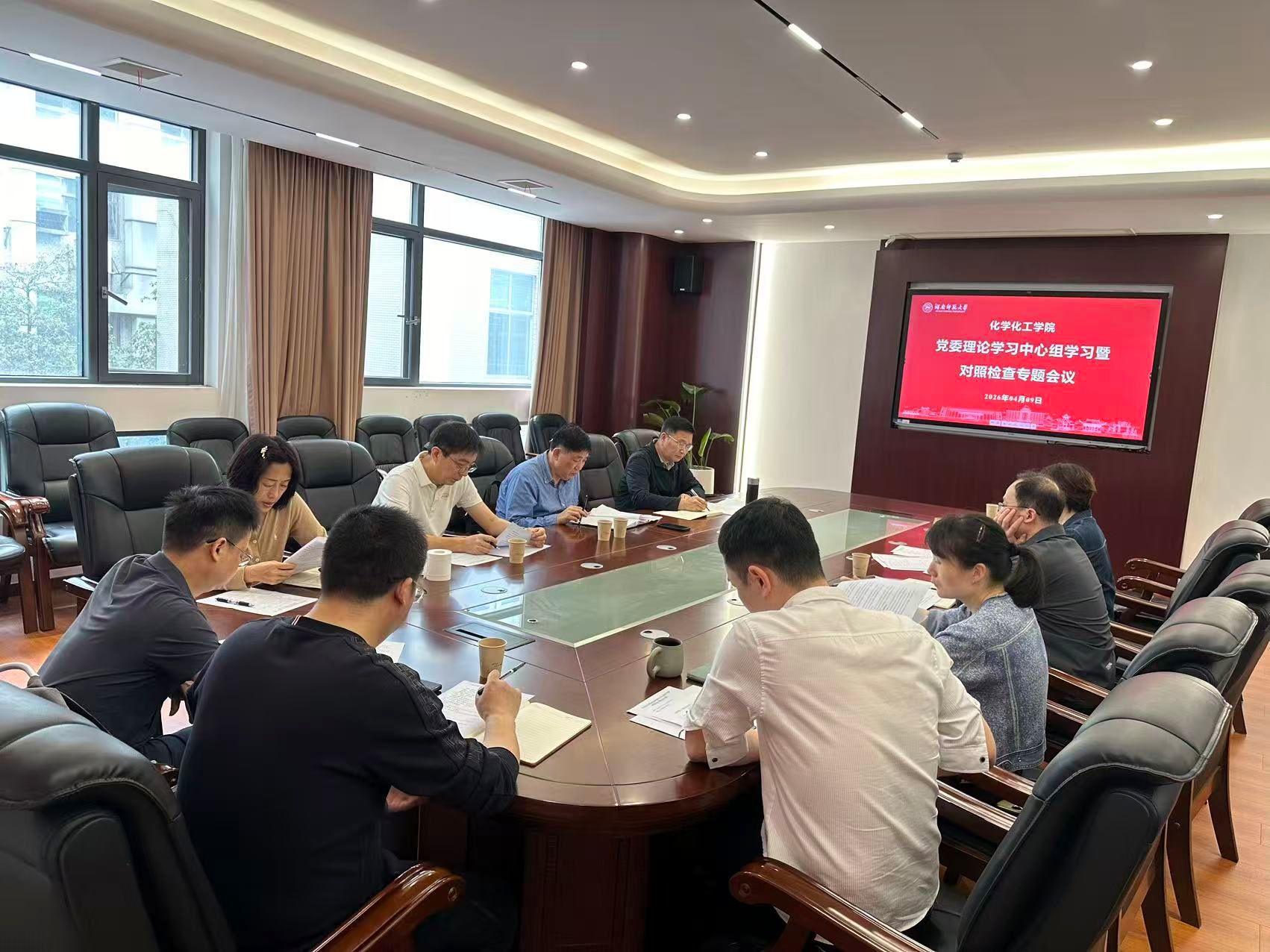 为深入学习贯彻习近平总书记关于树立和践行正确政绩观的重要论述精神,落实上级部署要求,2026年4月9日上午,化学化工学院党委在化学楼206会议室召开理论学习中心组学习暨对照检查专题会议。会议由学院党委书记谭东波主持,学院全体领导班子成员参加。